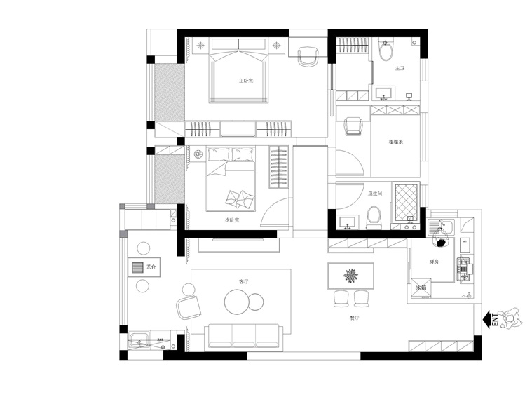 本案特點:客戶是兩個九零后的小夫妻,因為職業是醫生,白天在醫院嘈雜的環境中工作,希望回到家能感覺到溫暖舒適,所以本方案采用了溫和的色系,暖色光源的回形吊頂,簡單大方。