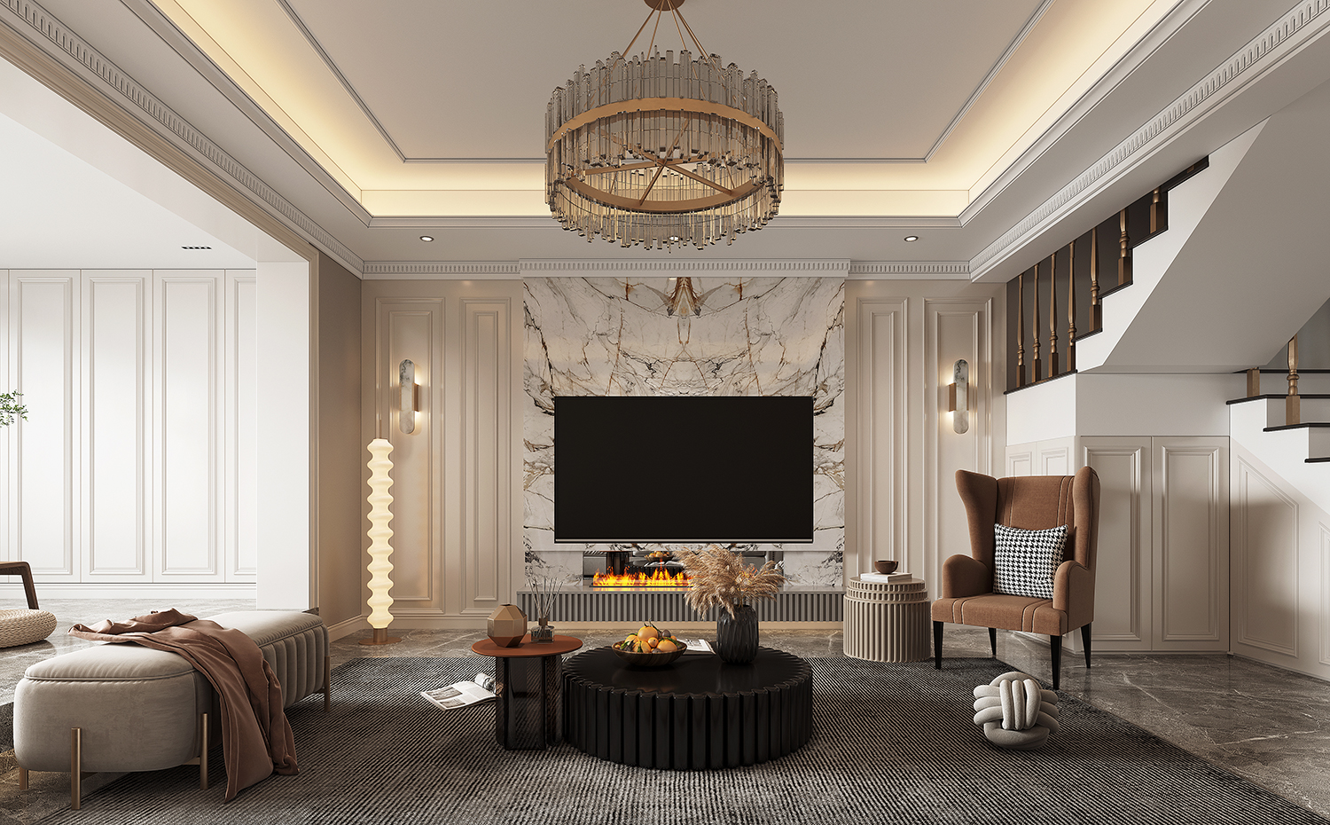 設計理念:客廳以灰色作為主色,黑白點綴其中,呼應電視背景墻的爵士白大理石,張弛之間,盡顯包容大度之態;落地氣泡燈活脫一個頑皮的精靈,平添幾分俏皮可愛氣;