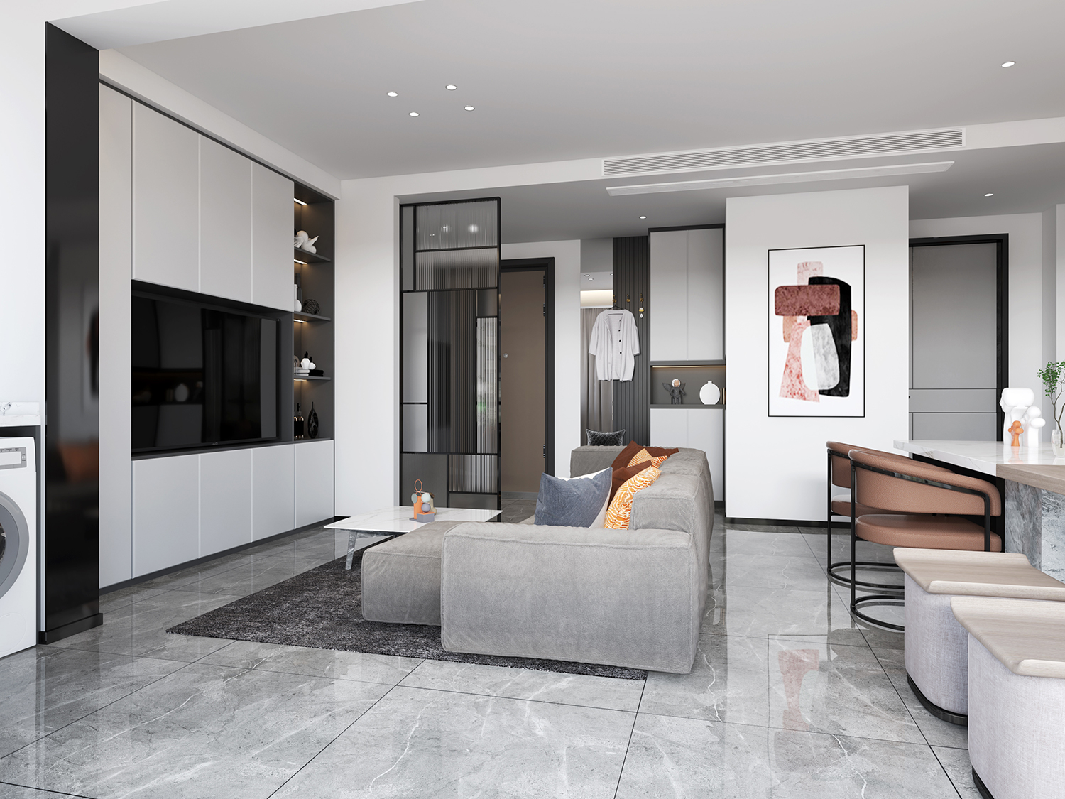 雖然此戶型是客廳朝東的戶型但是采光極好,由于正門口正對窗戶,在裝修風(fēng)水男業(yè)主對這方面比較忌諱。但是又怕這個地方做傳統(tǒng)的玄關(guān)一進門實現(xiàn)有又比較暗。所以采用的是半墻辦玻的的隔斷,放上有個藝術(shù)品使得入門空間的既視感瞬間上來的同是又不會阻擋東向的采光還解決了入戶門正對窗戶的問題。充分的鞋柜空間再加上利用公共空間把冰箱外置更增加了廚房的空間,客餐廳一體的設(shè)計更加增加空間的通透感。加上現(xiàn)代的家具讓整個空間更賤簡介明快。