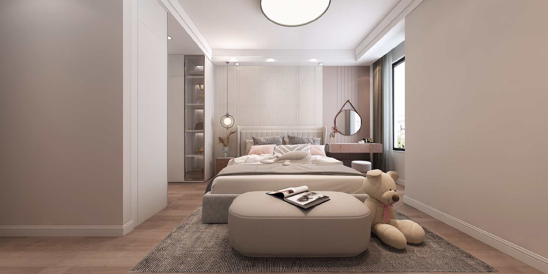 主臥:由于是婚房,主臥粉色墻板為整個空間增添了一些浪漫的氣息