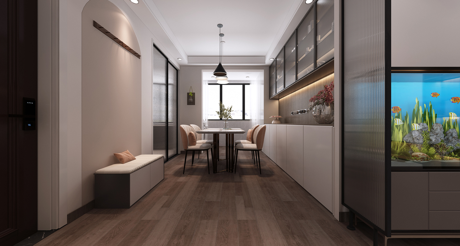 客廳:此戶型南向臥室較小將南向陽臺歸于臥室所用,同時為增加客廳采光,保護臥室隱私,采用隔柵作為南向陽臺與客廳之間的隔斷,既保證了客廳的采光,也維護了臥室的隱私,電視墻的儲物格設(shè)計滿足了客戶收納需求,由于客戶不需要晾曬陽臺,北陽臺融為了餐廳的一部分,餐邊柜與儲物柜的設(shè)計讓整個空間連貫的更加完整,公共區(qū)域最大化的收納滿足了客戶后期人口變化對儲物的需求