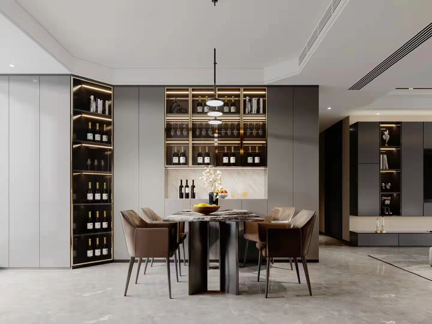 本案特點(diǎn):公共空間選擇色調(diào)統(tǒng)一的黑白灰進(jìn)行呈現(xiàn),利用不同材質(zhì)的鋼板、木板、地磚對空間進(jìn)行分割之后再融通,為空間創(chuàng)造出更多元化的生命力。局部輔以愛馬仕橙點(diǎn)綴,增加靈動(dòng)與生機(jī),演繹出既理性又裹帶溫柔熱度的獨(dú)特氛圍,為屋主打造出有趣的、富有自身特質(zhì)的生活空間。為空間去掉多余的壁壘,將墻體統(tǒng)一并模塊化,打造出簡約的視覺風(fēng)格。頂部磁吸軌道燈替代主燈,可隨意變換位置的特性打造出多變的靈活性,同時(shí)流暢的線條感為空間延伸出適度的深度。