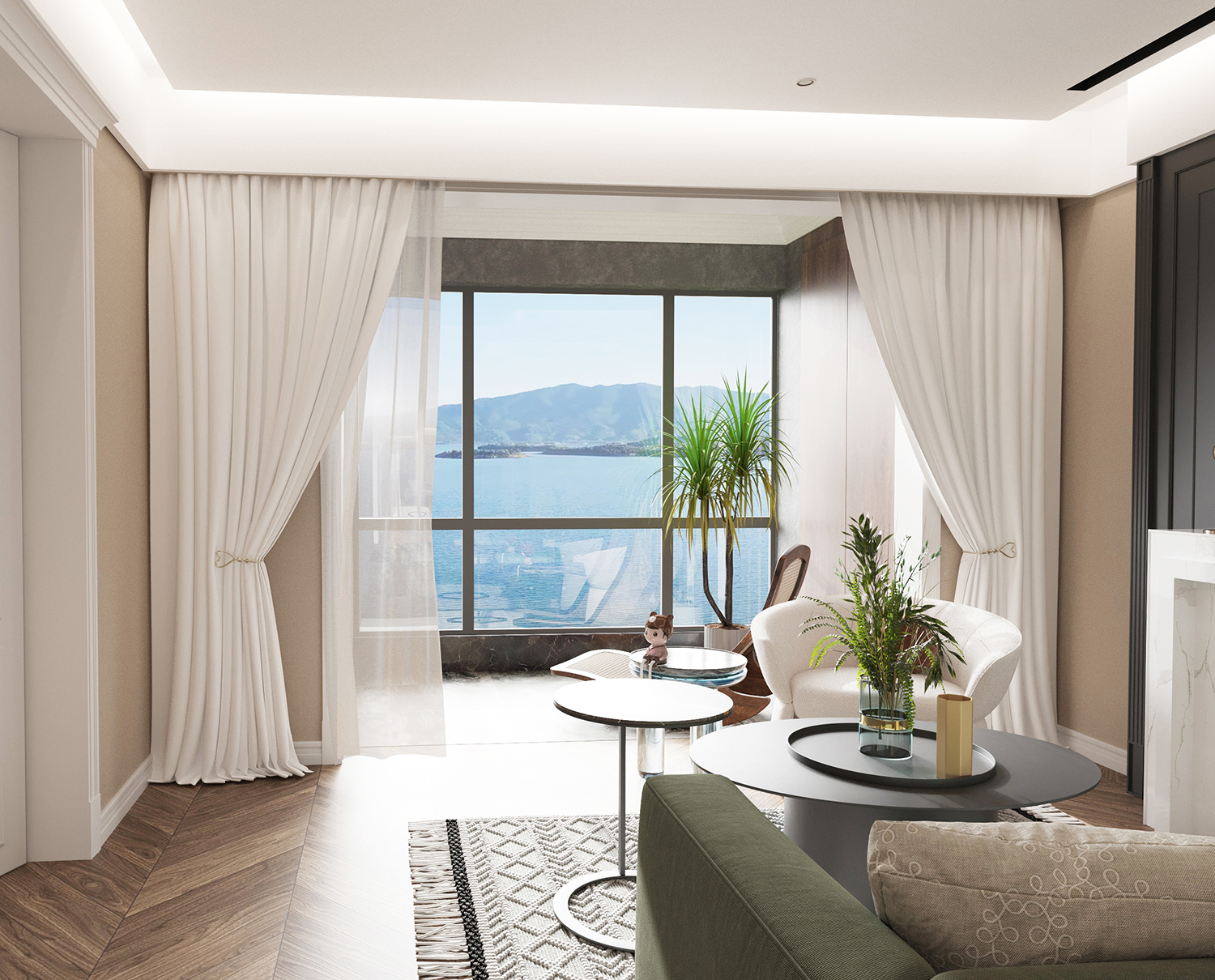 設(shè)計理念:作為度假的房子來說,空間的大小是次要的湖邊的景色才是重中之重,工作之余一家人慵懶的呆在度假村屬于自己的套房內(nèi),要享受足夠的湖景帶來的愉悅,還要舒舒服服的慵懶的床上沙發(fā)上,節(jié)奏慢下來做個想嘗試已久的拿手大菜與家人分享,生活輕松愜意。