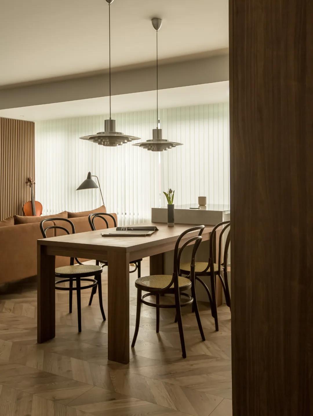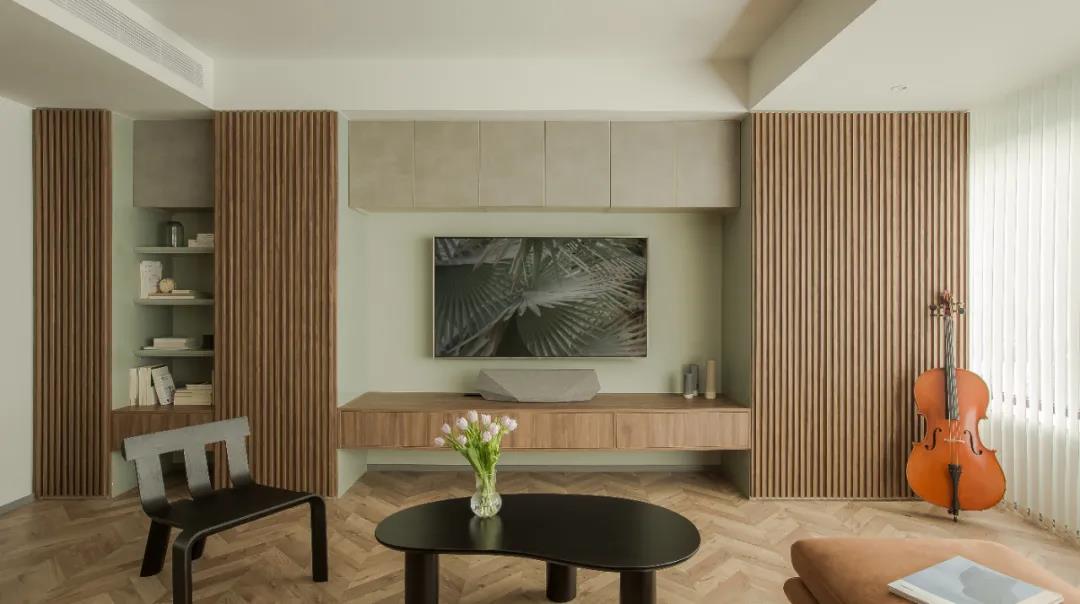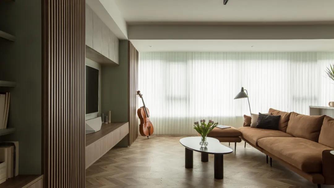 設計理念:窗簾選擇了垂直簾,和大面積的木格柵板相映成趣,入室的陽光形成的條紋光影,隨日照方向在室內游動,音樂和陽光同時在家彌漫。
