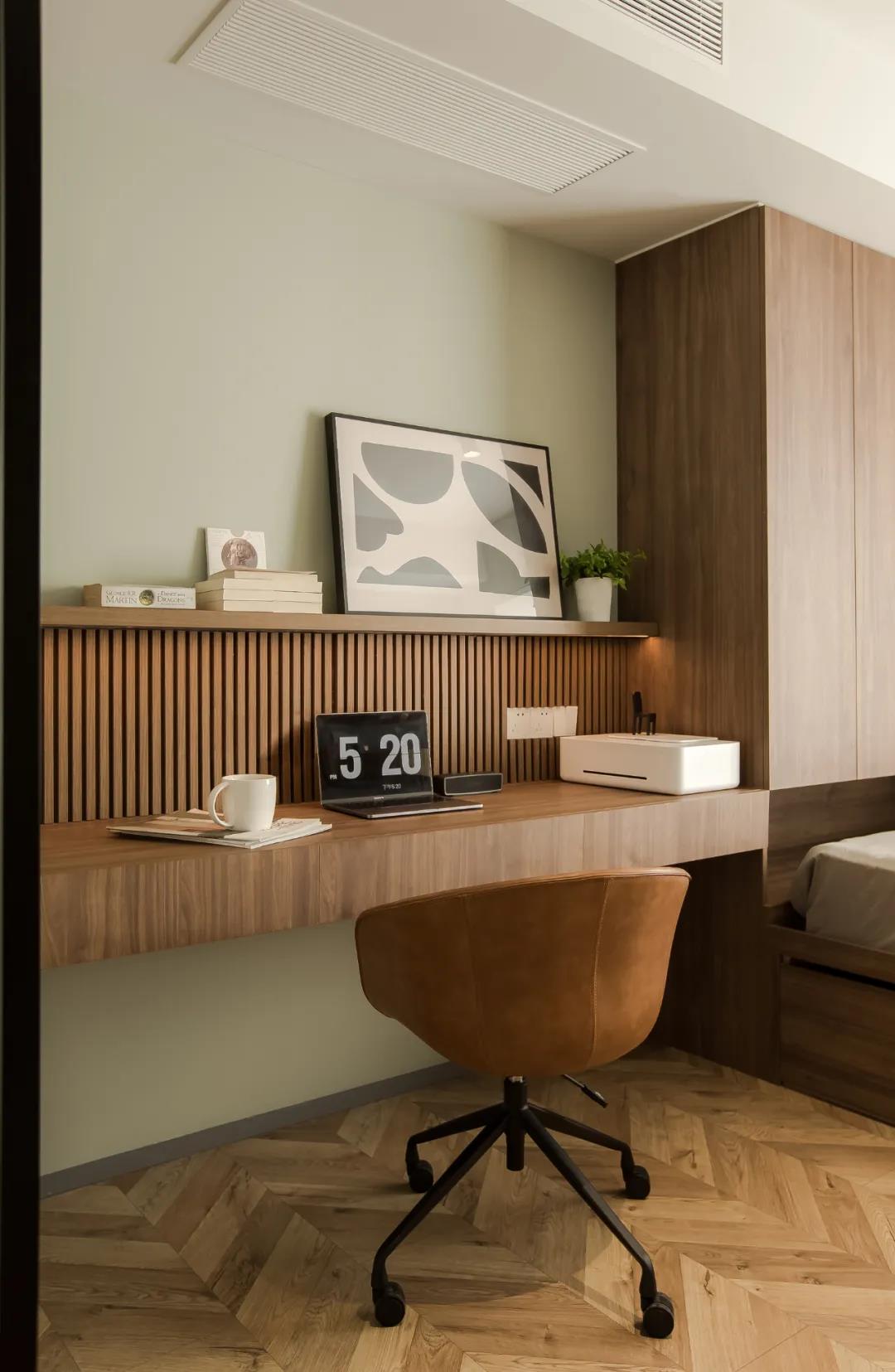 書房設置了1.6米的榻榻米+衣柜收納,滿足客人到訪臨時居住的需求,近兩米書桌和書柜組合又很好了滿足屋主平時在家辦公的要求。