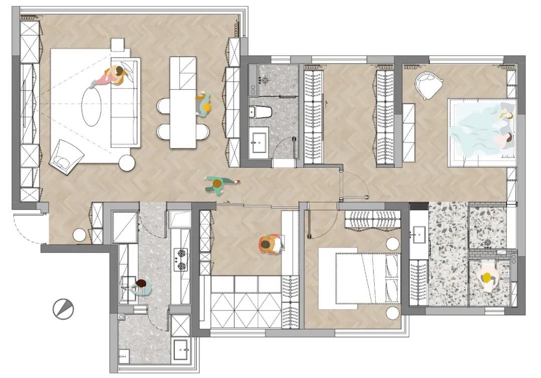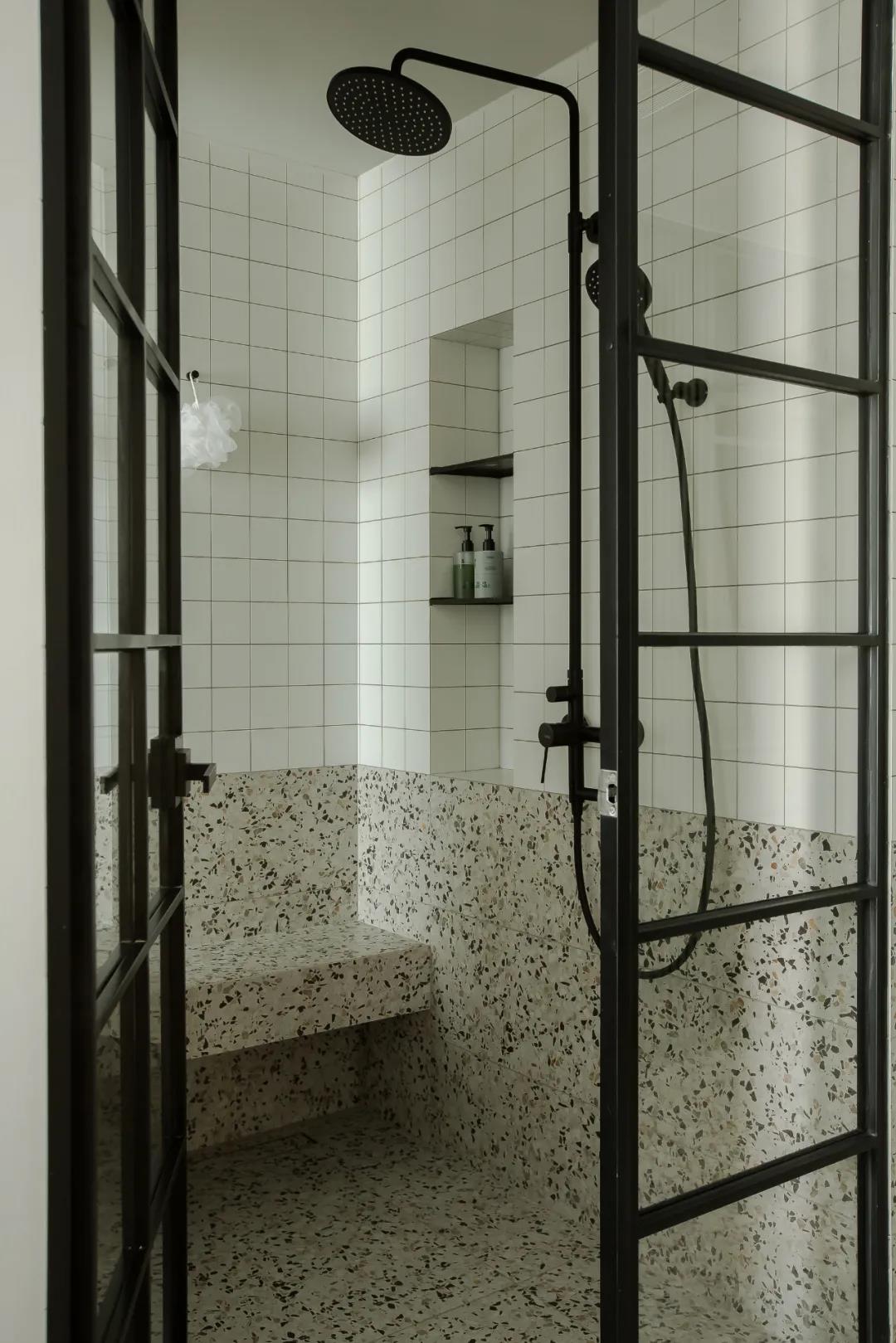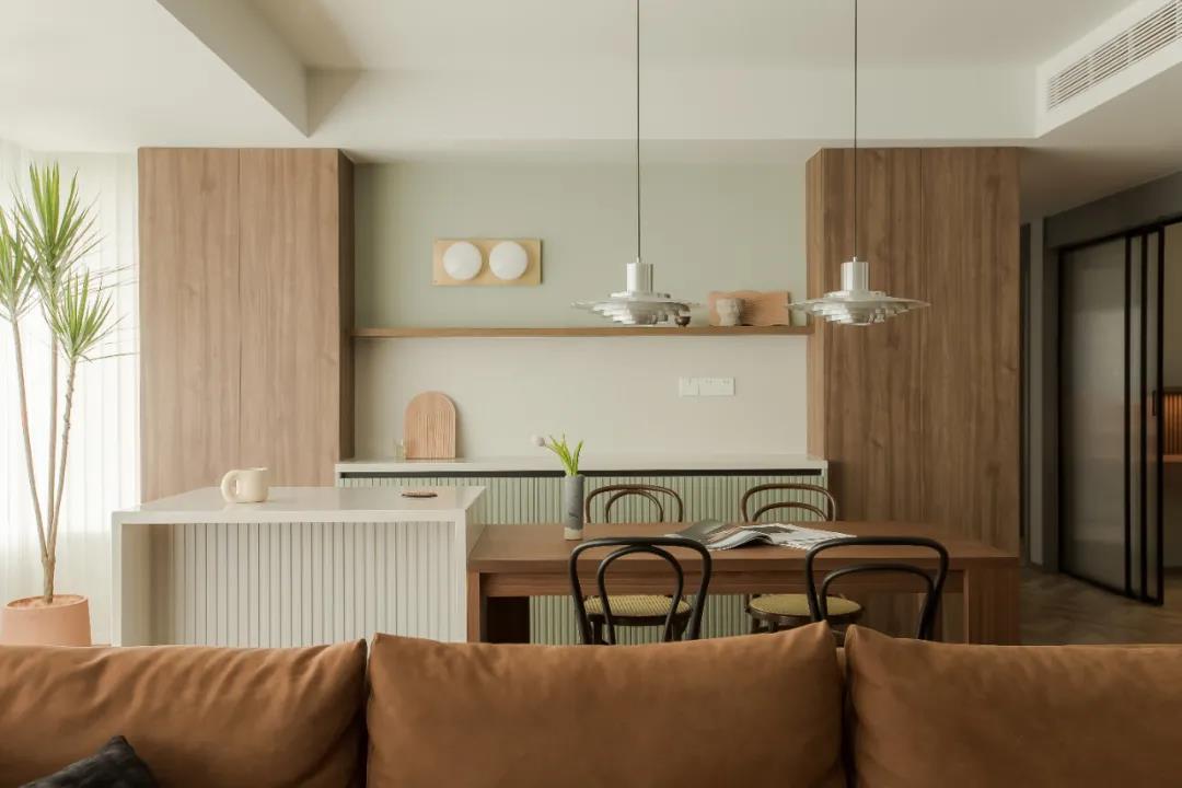 廚房空間的墻地都使用了同款水磨石磚,使空間更加整體簡潔,弱化空間狹長的感受,同時木色柜體帶出家的溫暖氣息。