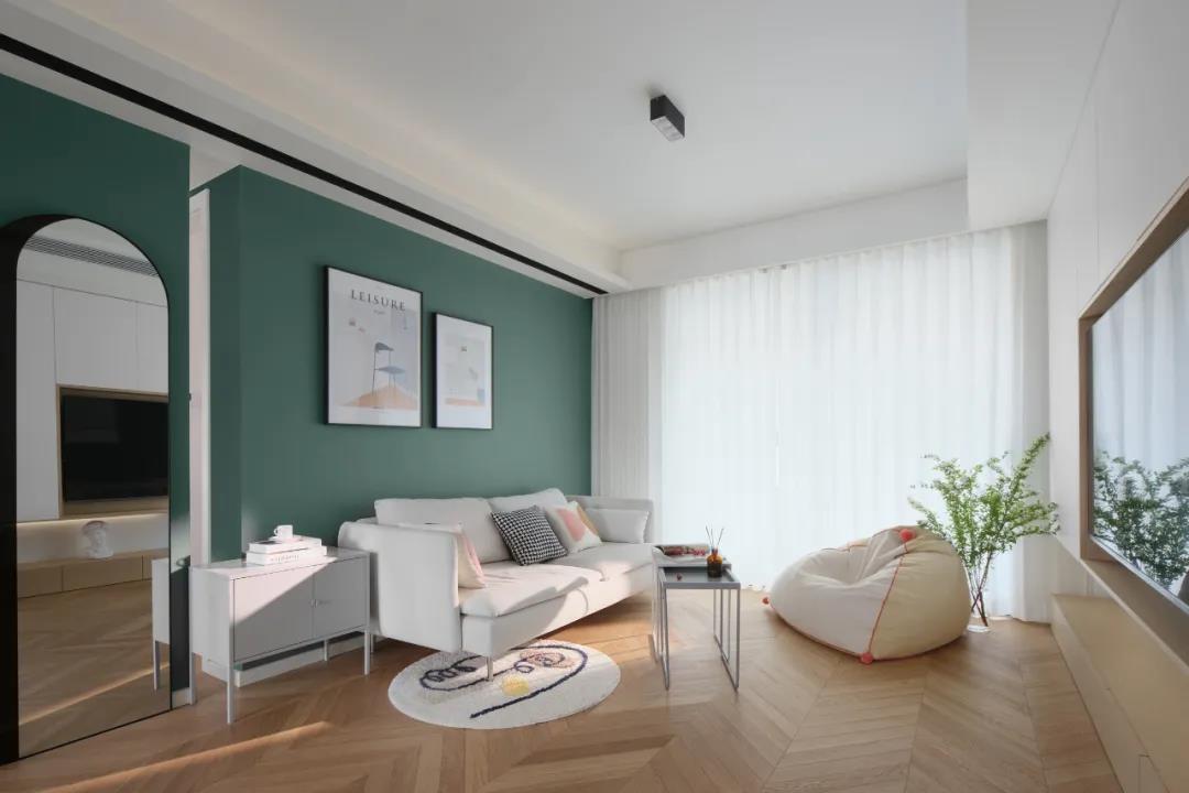 原木魚骨拼地板增加空間的視覺張力,強(qiáng)調(diào)了客廳井然的秩序感和自然元素。