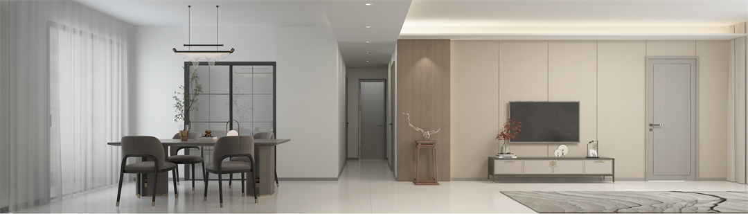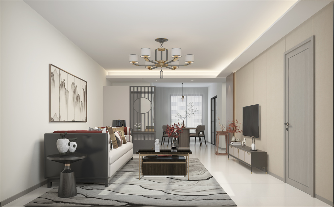 設計理念:本案定位新中式風格,著色清新自然,以現代融合中式山水元素,營造空間寫意的生活空間。