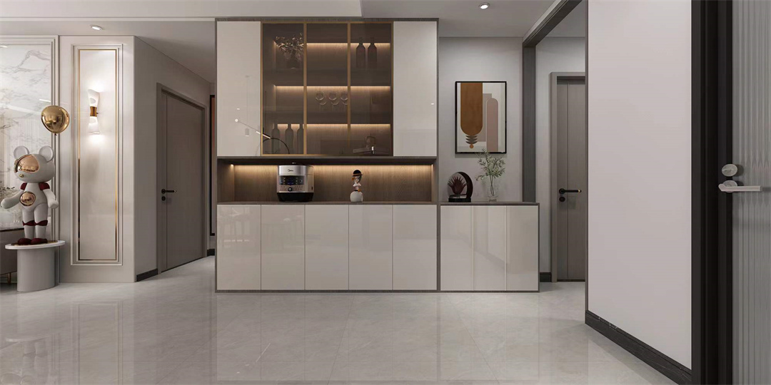 餐邊柜融合酒柜功能,以玻璃結(jié)合門板的形式交錯呈現(xiàn),實現(xiàn)美感與功能的雙重效果。