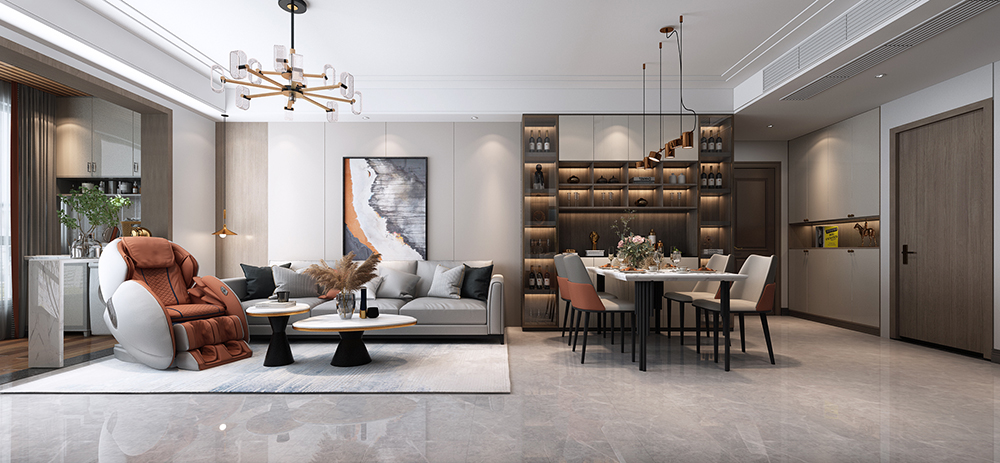 沙發(fā)背景以護(hù)墻板+掛畫(huà)做造型裝飾,不銹鋼線條層次分割,與酒柜形成動(dòng)靜分區(qū),更好的服務(wù)空間,藝術(shù)生活。