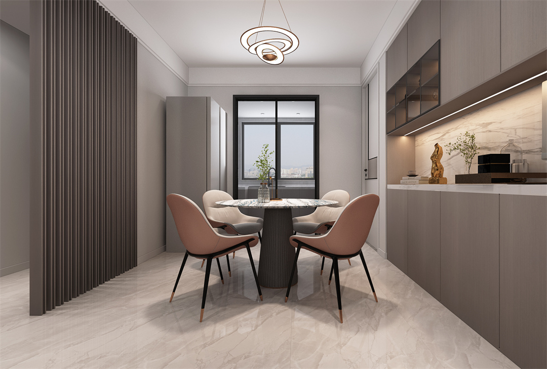 餐廳放置圓形巖板餐桌,以咖色的餐椅做色彩的局部點(diǎn)綴。一整組餐邊柜的設(shè)計(jì),既增加臺(tái)面操作區(qū),又實(shí)現(xiàn)了對(duì)儲(chǔ)物功能的強(qiáng)烈需求。