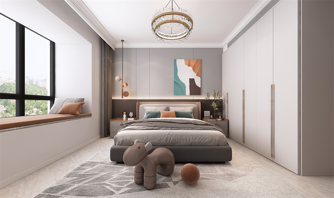 主臥以灰色為主,床頭內(nèi)嵌燈帶,再懸掛黃銅線(xiàn)性燈,為空間增添輕奢的質(zhì)感。