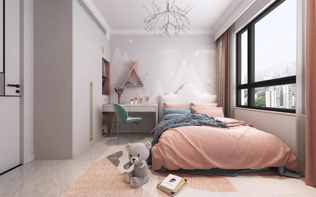 女兒房充滿(mǎn)夢(mèng)幻的色彩和元素,頂面水晶玻璃燈、墻面星星蝴蝶閃閃發(fā)光,充滿(mǎn)童真童趣。