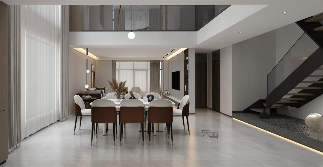 餐廳區域挑空,與廚房、島臺、餐廳形成聯動,塑造空間秩序的美感。