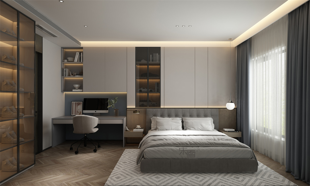 兒童房通過書桌連柜的設計,將儲物形式與空間層次飽滿。在這里,設計師巧妙利用模擬柜門的形式做整墻的造型連接,讓空間保持完整和統一,提升居者的體驗感。