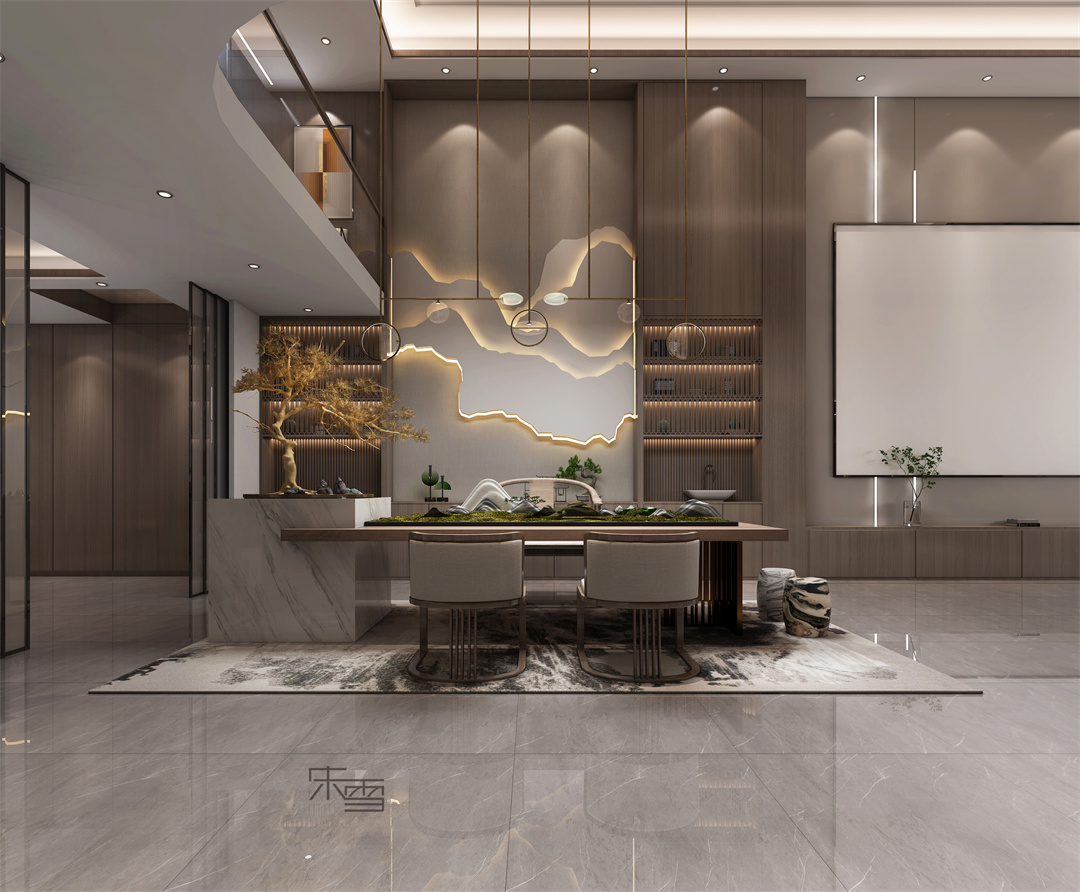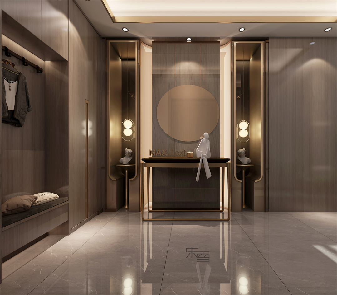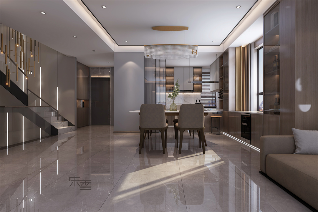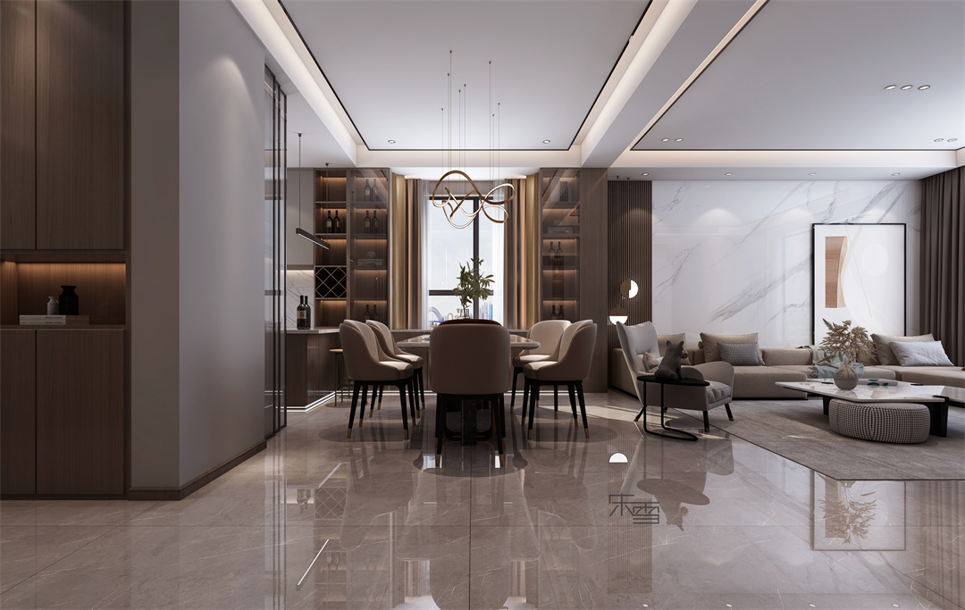整個(gè)空間以胡桃色貫穿上下,暖黃色燈光點(diǎn)綴,來營造輕奢的氛圍。