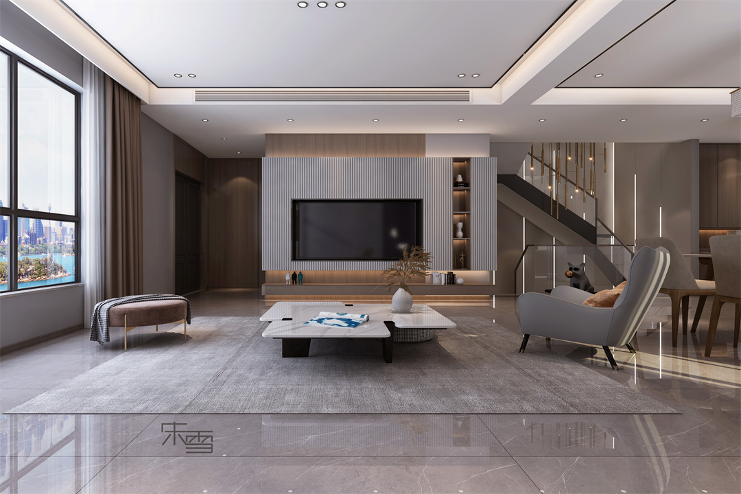 本案特點(diǎn):應(yīng)業(yè)主需求,風(fēng)格定位現(xiàn)代輕奢,富有科技感。