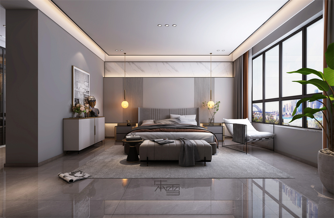 臥室造型多使用線條來裝飾,與整個(gè)環(huán)境相稱,既簡單凝練又富于趣味。