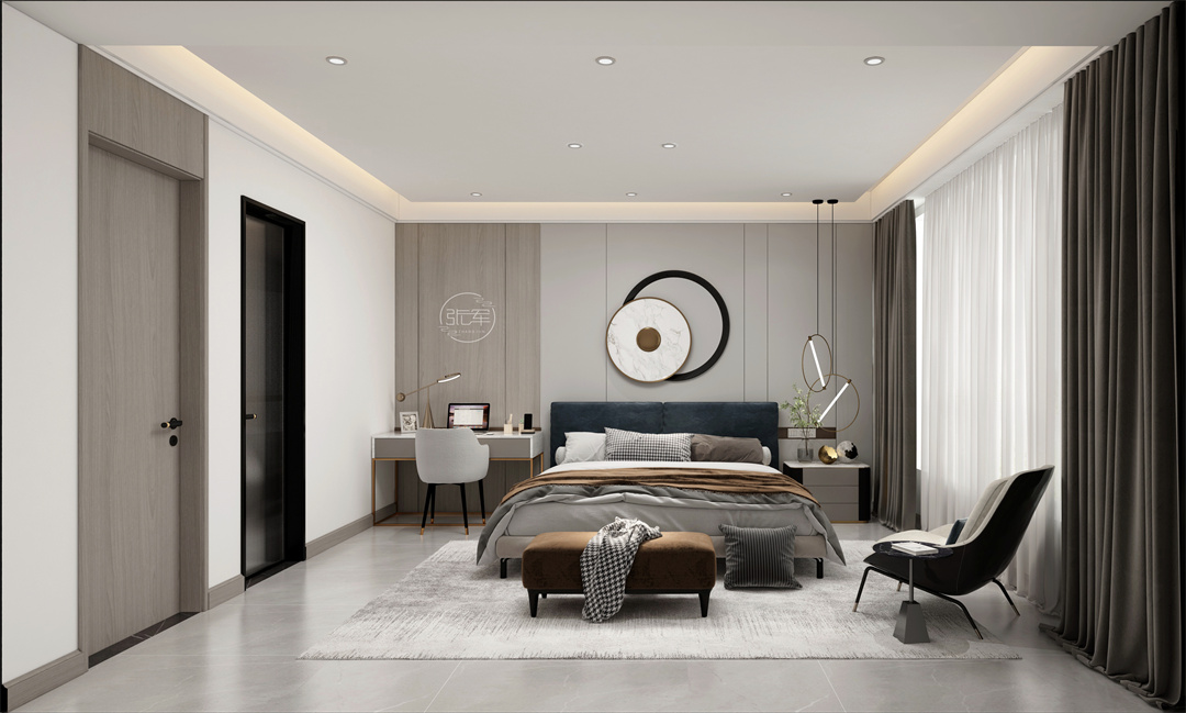 臥室雅致簡約,精巧的燈具、雅致的掛畫、軟裝配飾等,使整個居室在現代氣息中滲透幾許中式風韻。同時灰白顏色的運用,讓空間告別沉悶,處處散發著簡潔優雅的層次之美。