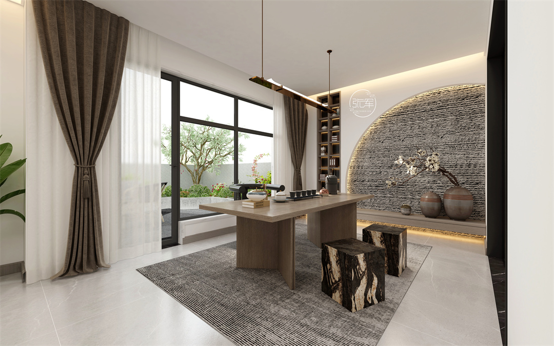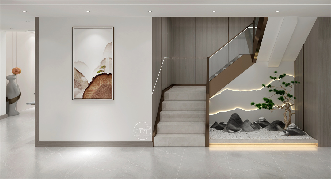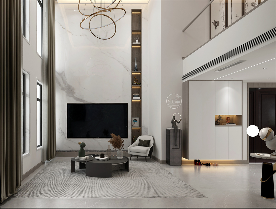 整案空間色調素凈雅致,灰白相間,黑白相生,讓空間充滿了寫意水墨的氣質。客廳電視墻一側挑高,石材通頂,氣勢恢宏。
