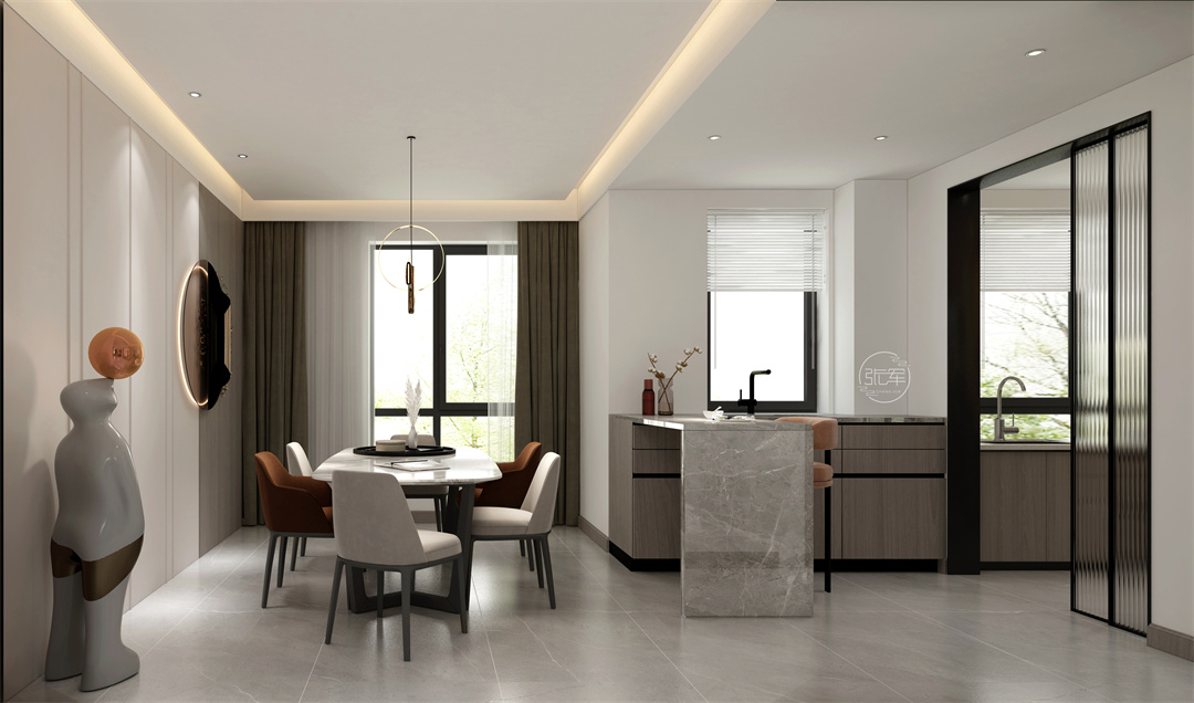 門廳以水墨畫點綴傳統元素,巧妙融入到設計中,與餐廳現代元素的吊燈相結合,讓空間兼具傳統與時尚。