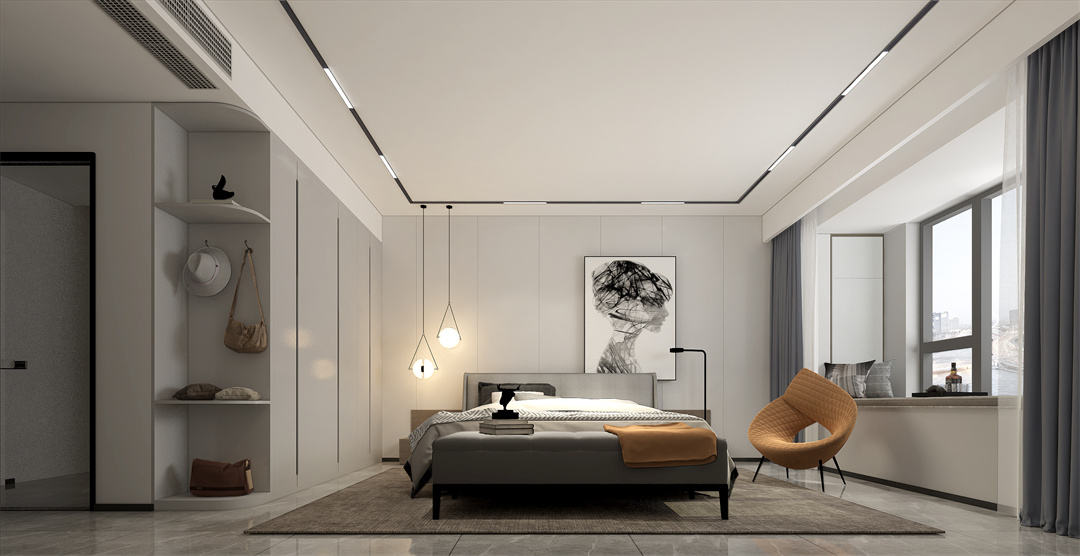 主臥空間感很強(qiáng),簡(jiǎn)約透著日式的寧?kù)o,可以包容生活中所有的情緒,給心靈一處回歸的居所。