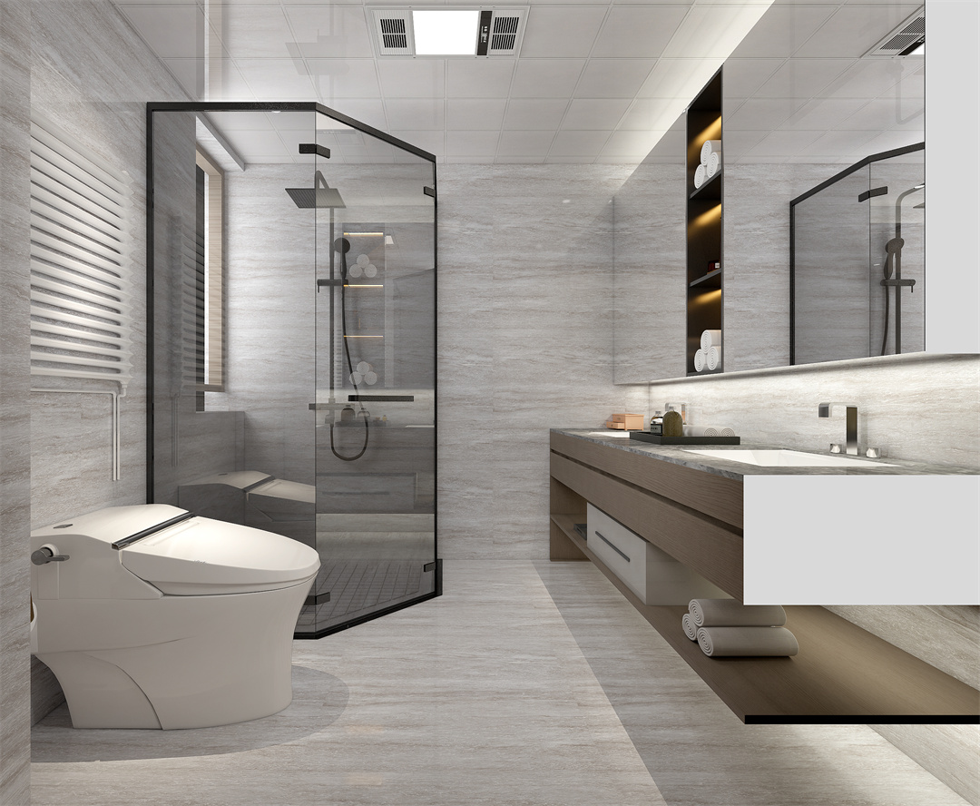 衛(wèi)生間成三角布局動線,玻璃淋浴房與干區(qū)分離,防止水花亂濺。