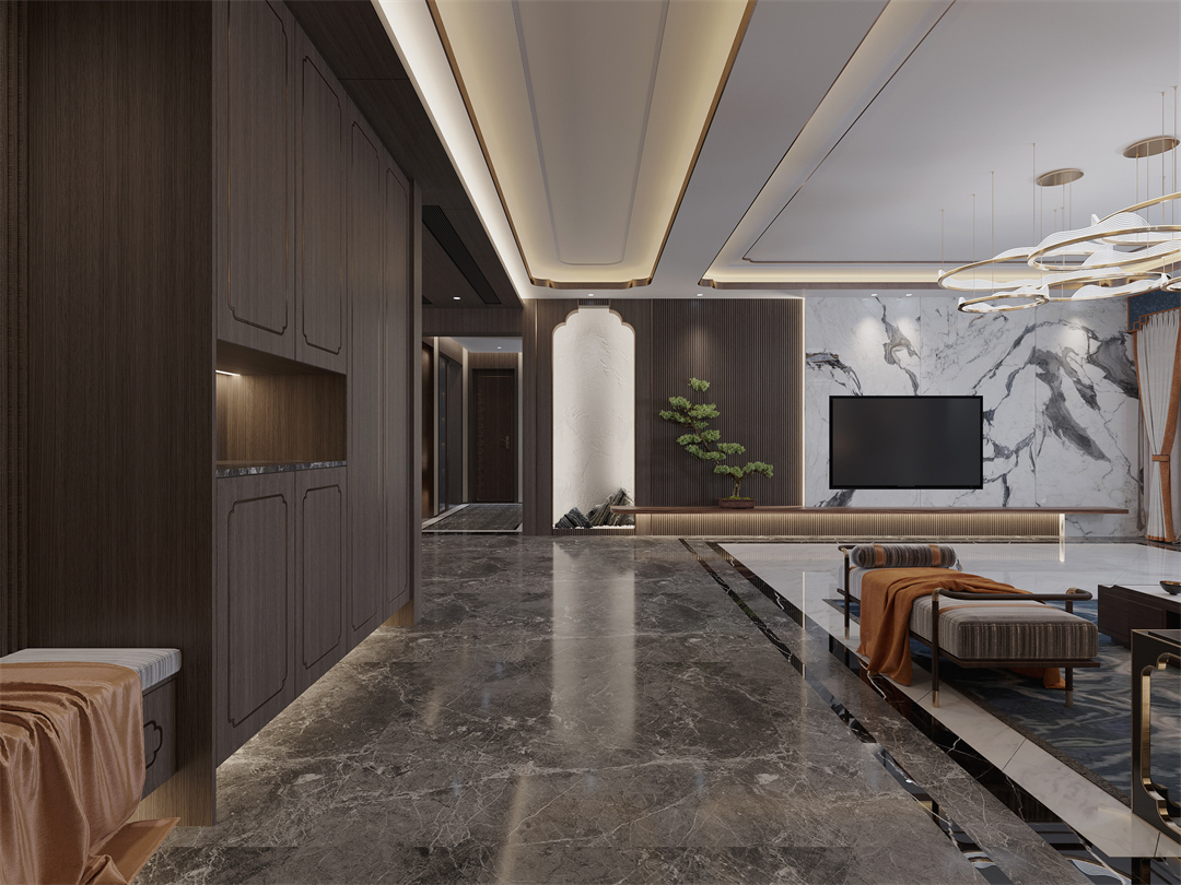本案特點:業(yè)主是三世同堂,老人喜歡中式的典雅,而女業(yè)主喜歡現(xiàn)代風(fēng)格的輕奢與質(zhì)感,因此將家里定位成新中式風(fēng)格,這樣滿了兩代人的裝修需求。