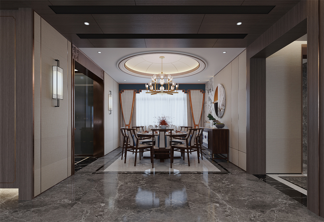 餐廳這里巧妙地將中式韻味和現(xiàn)代感重新組合,圓形吊頂與餐桌和諧統(tǒng)一,整個設(shè)計簡潔溫馨。