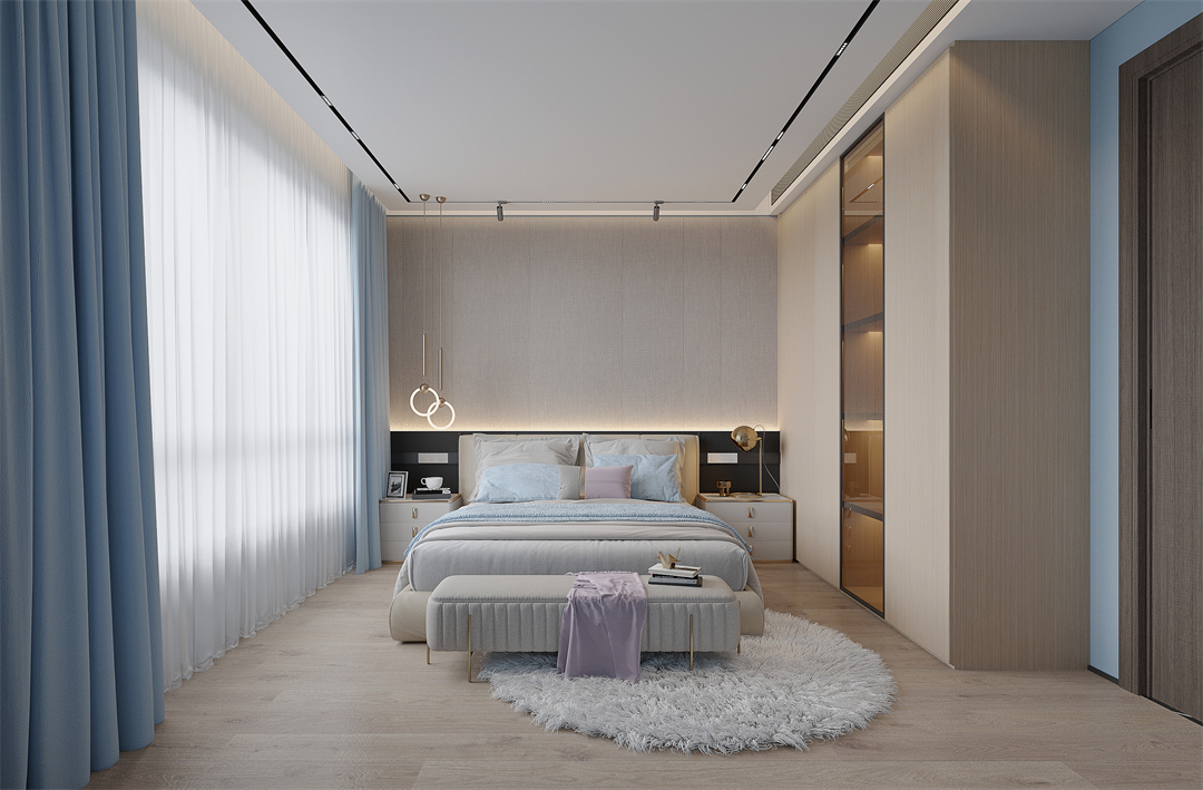 主臥以現(xiàn)代元素為主,木柵格+大理石作為床頭背景墻,個性張揚又大氣。