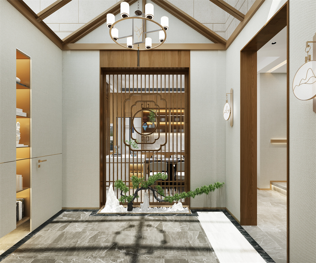 講究空間層次和跳躍感是新中式風(fēng)格的重要特點(diǎn)之一,一般使用中式的木門或者屏風(fēng)用于隔絕視線,體現(xiàn)著層次的美感,非常的神秘,整體空間豐富又不累贅。 屏風(fēng)讓整個(gè)空間處于虛實(shí)之間,隔而不斷,它是中式風(fēng)格中最具代表性的裝飾元素,由擋屏、雕花、綢緞組合而成??蛷d或玄關(guān)中都可以擺放屏風(fēng),既能作為隔斷所用,又能增添室內(nèi)古典氣息。