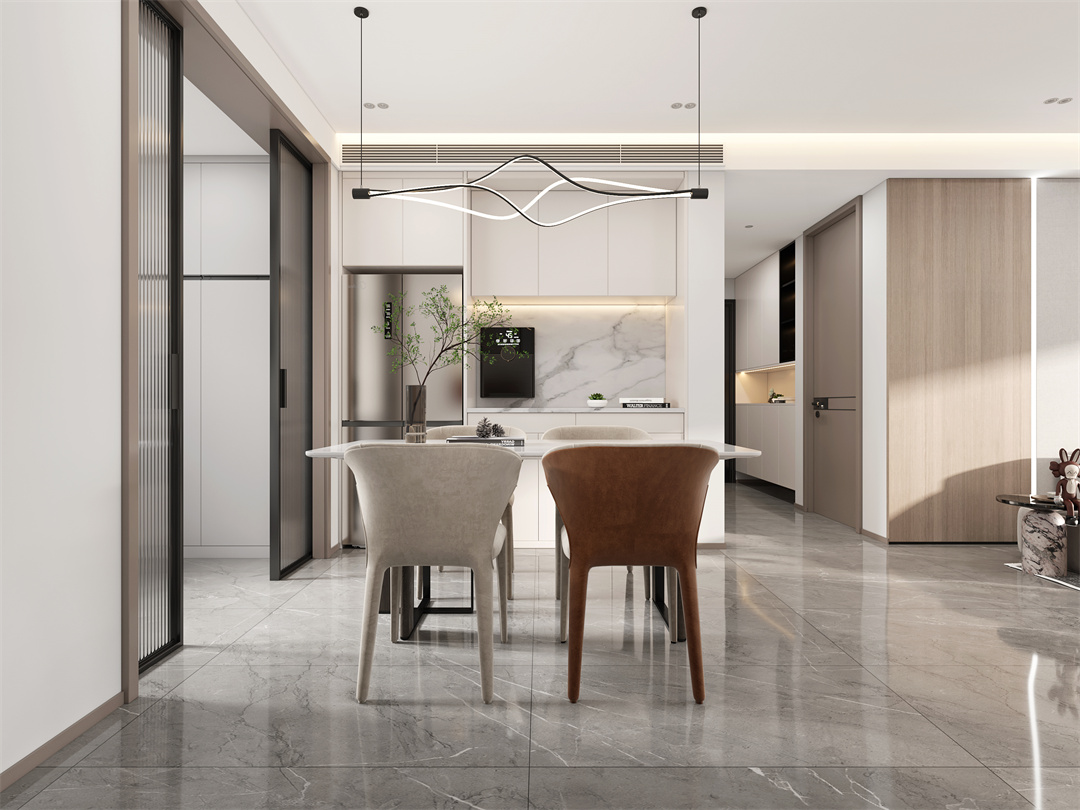 餐廳與客廳連貫的硬裝設(shè)計(jì),使得空間感更加高級(jí)優(yōu)雅而統(tǒng)一大氣。