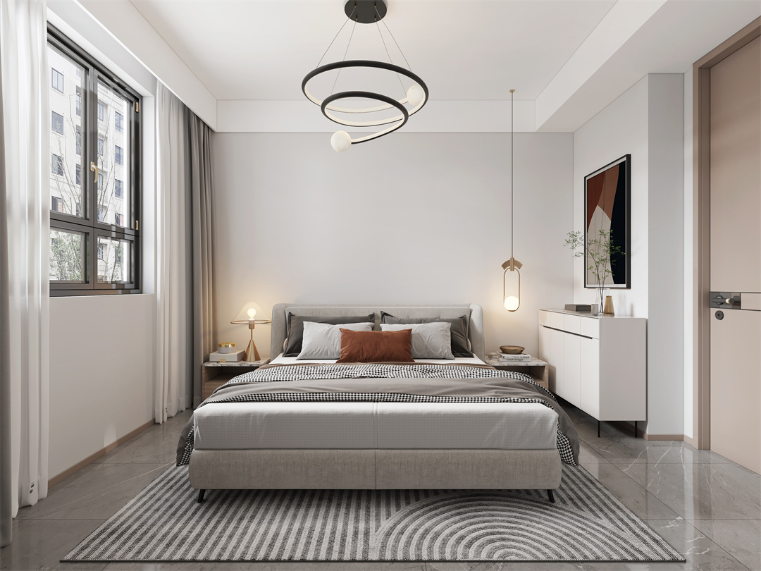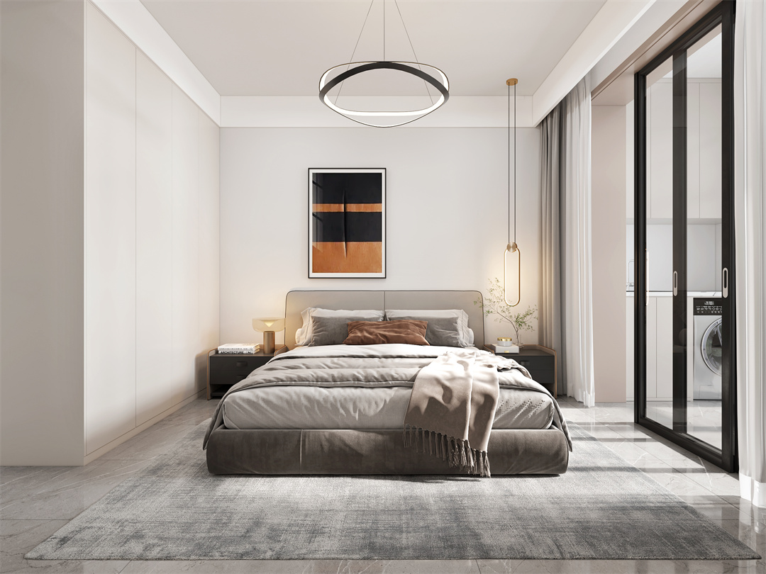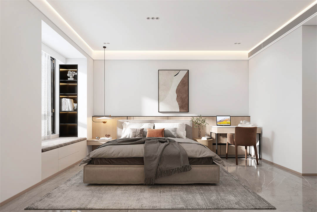 主臥整體硬裝與軟裝都以白色與木質(zhì)感的空間為主,加入灰色毯子與枕頭,也是點(diǎn)亮了空間的高級(jí)設(shè)計(jì)感。側(cè)邊的衣柜以白色為主,搭配在低調(diào)的高級(jí)灰空間里,效果也是更加和諧統(tǒng)一。
