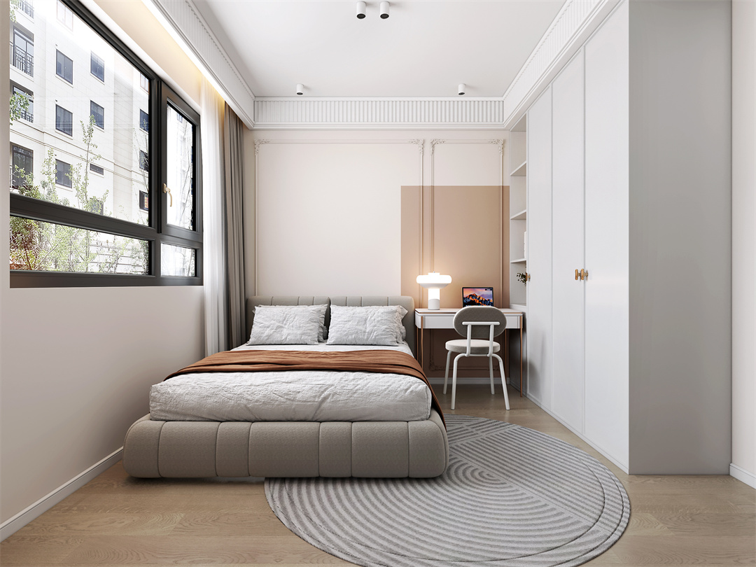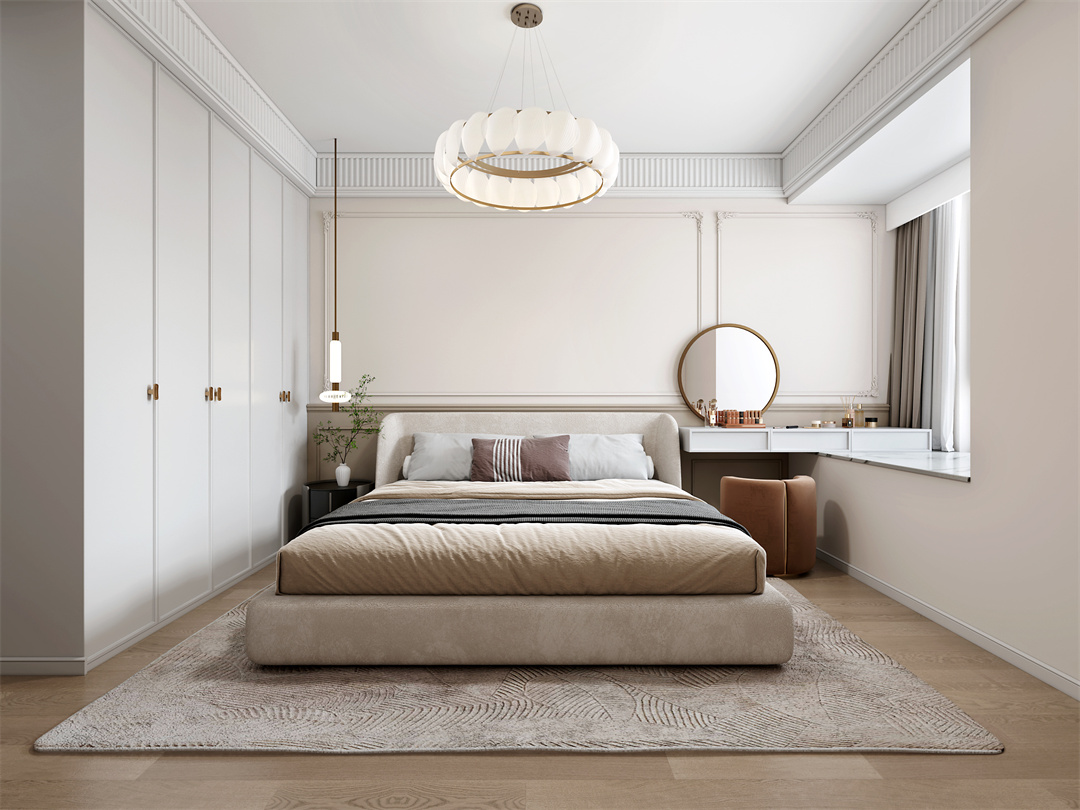 主臥采用簡約的線條進行裝飾,去掉傳統床頭柜,飄窗梳妝臺相結合,給人眼前一亮的感覺,柔和的光線更顯舒適。