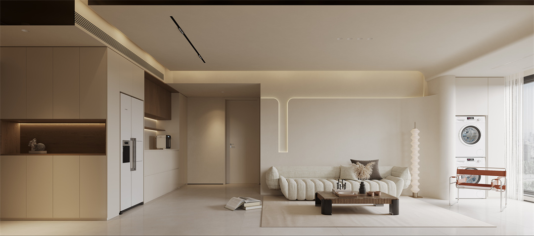 餐廚一體使得空間更開(kāi)闊,嵌入式冰箱,蒸箱和儲(chǔ)物柜的搭配增加了實(shí)用性。硬朗的大理石臺(tái)面搭配白色的定制柜散發(fā)出原始的魅力,以及簡(jiǎn)潔的線條表達(dá)出“食本味,衣本色,住本體”的生活追求。