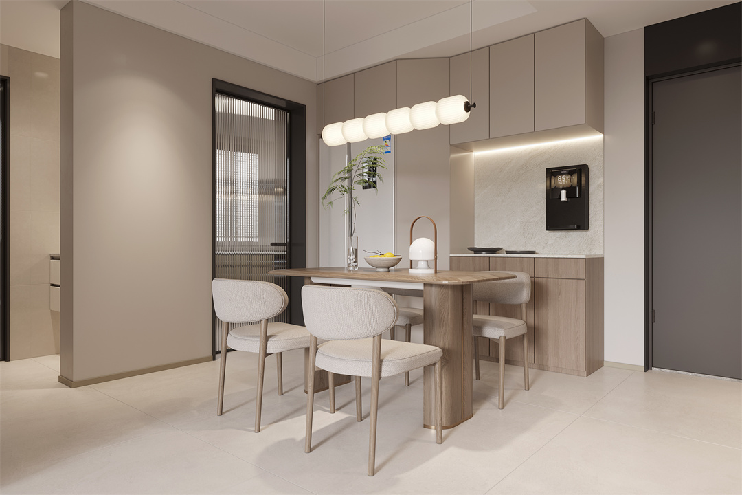 原木色餐臺搭配卡其色餐椅,一字極簡吊燈營造溫馨的就餐氛圍,提升空間質(zhì)感。