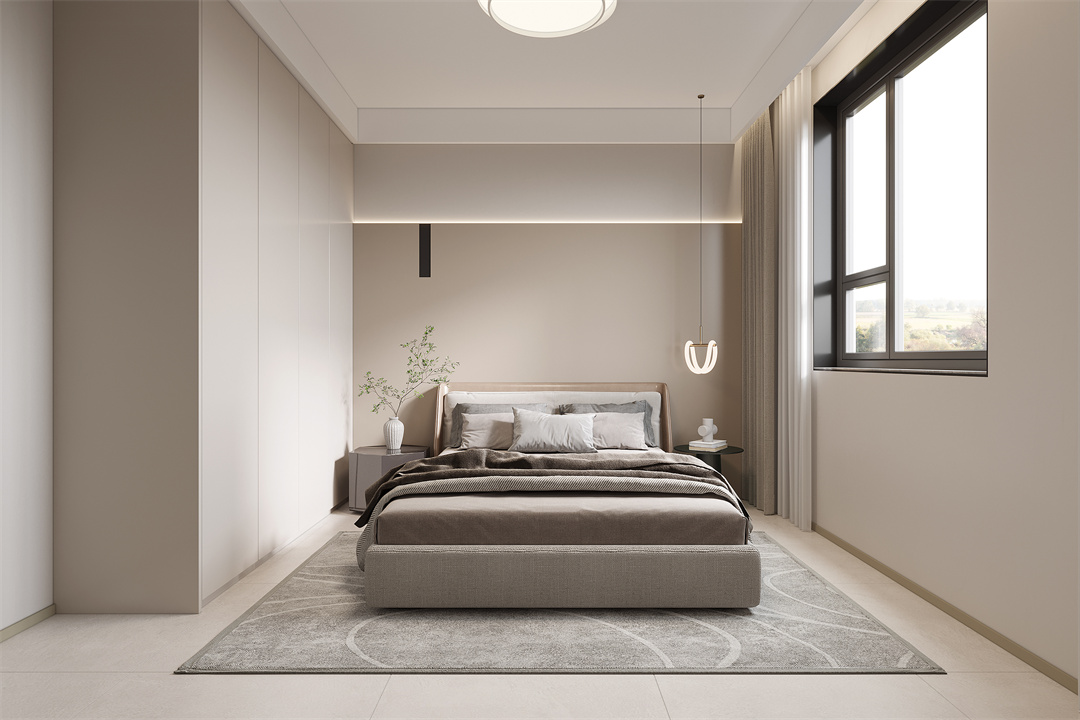 暖色系的地面瓷磚通鋪,加上的深色系地毯進行打底,主燈通過點光源和隱形光源作照明,盡顯空間的簡約大方。