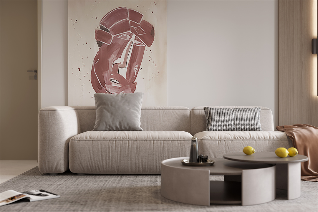 沙發(fā)背景藝術(shù)感十足,和電視背景風格相呼應。