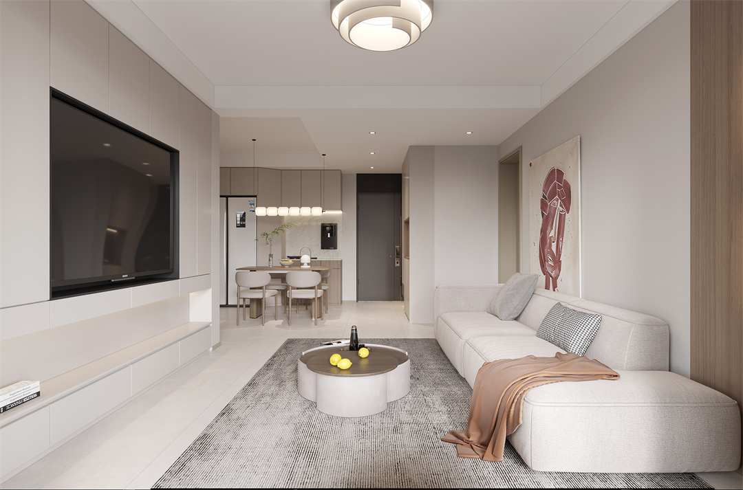 客廳的整體風格簡約大氣,陽臺納入客廳的設計拓展了空間面積,同時提供室內(nèi)采光。電視背景墻采用留白設計,搭配地臺提升溫潤空間質(zhì)感。