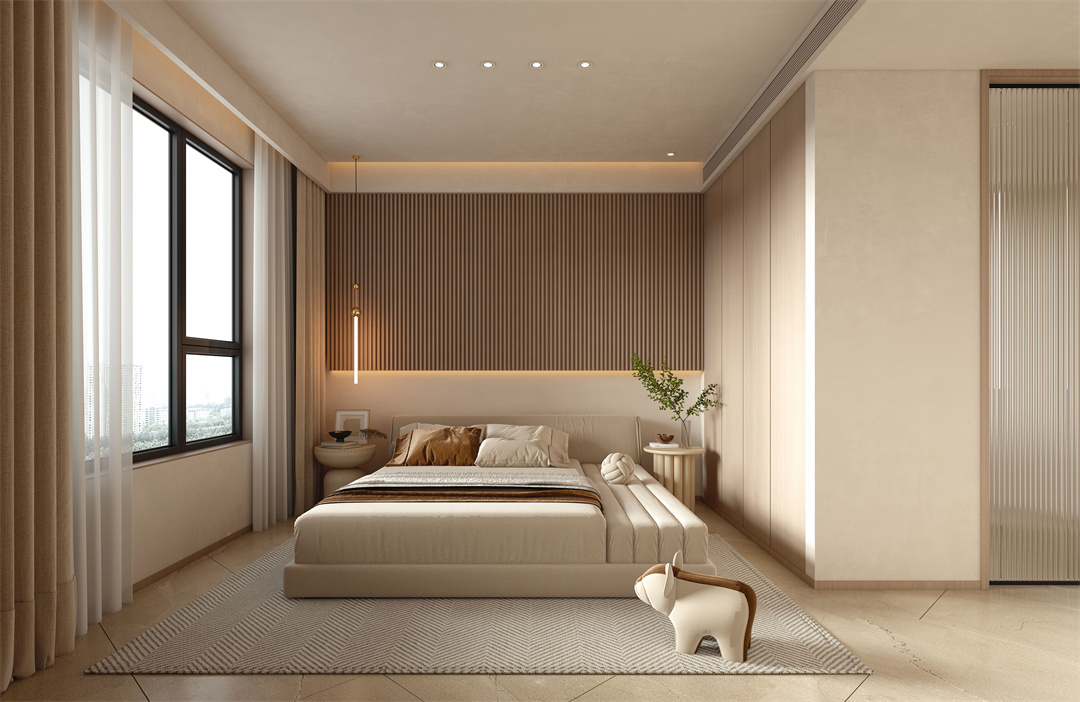主臥設計更偏向極簡舒適,這是一個幸福指數(shù)極高的主臥套房,經(jīng)過空間合理的利用,功能與顏值都拉到了極高。