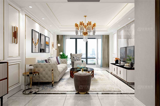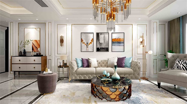 本案特點:本案設計效果上融合輕奢和美式相結合,整體色調像銀裝素裹中靜寂的景色,白色的干凈明亮,素雅高貴,金色線條的點綴,是皇室貴族彰顯貴氣永恒的通用手法。