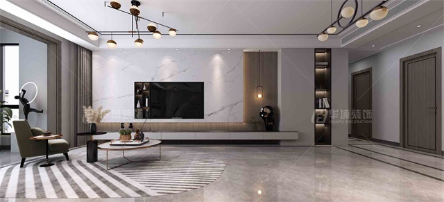 地面走撥打線呼應(yīng)頂面造型,整體感十足。電視背景用整面石材設(shè)計(jì),加以護(hù)墻板跳色。電視柜采用懸空設(shè)計(jì),后期更加方便打理衛(wèi)生。整個(gè)電視背景7米長(zhǎng)處理后協(xié)調(diào),美觀。整體裝修簡(jiǎn)約大氣。
