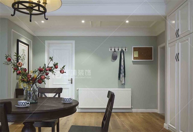 在設(shè)計(jì)上,墻面選擇淡淡的灰綠色來(lái)營(yíng)造整體浪漫輕松的氛圍,而在硬裝比如吊頂?shù)奶幚砩希梃b現(xiàn)代手法盡量簡(jiǎn)化,白色家具穿插其中調(diào)整氣氛,局部美式線條點(diǎn)綴勾勒。
