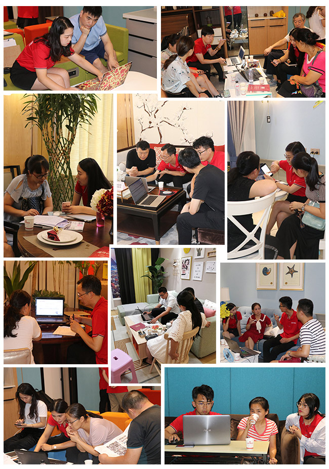 由于客流量過大,設計師都是提前搶占空位等待業主前來。就連我們的樣板間、材料展廳、廚房,也都是客戶與設計師洽談的身影。