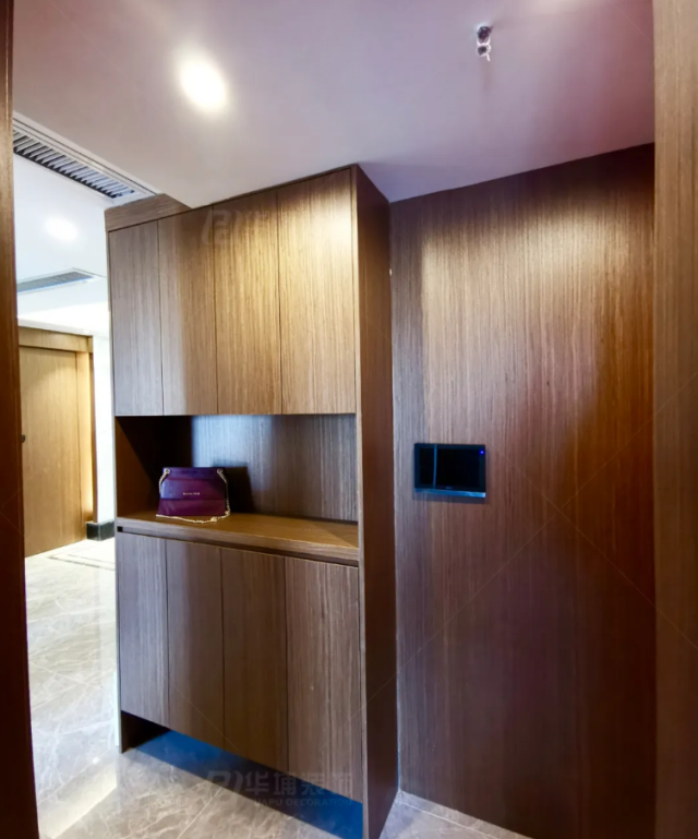 入戶是一整組木質玄關柜,墻面采用的實木護墻板,同色設計讓空間更加規整。玄關柜是吊柜+地柜的組合形式,鞋柜墻體內側連接的就是我們的水吧臺區域,冰箱內嵌在這里。