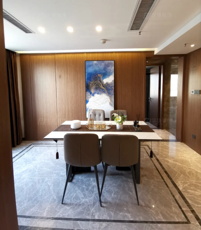 客餐廳通過做出來的玄關造型進行功能分區,同廚房做開放式設計,以拉伸空間感。餐廳背景墻是四塊護墻板均等均分,再以一幅掛畫做點睛。餐桌選用的是高硬度的巖板臺面,搭配皮質的餐椅,盡顯奢華的品質。