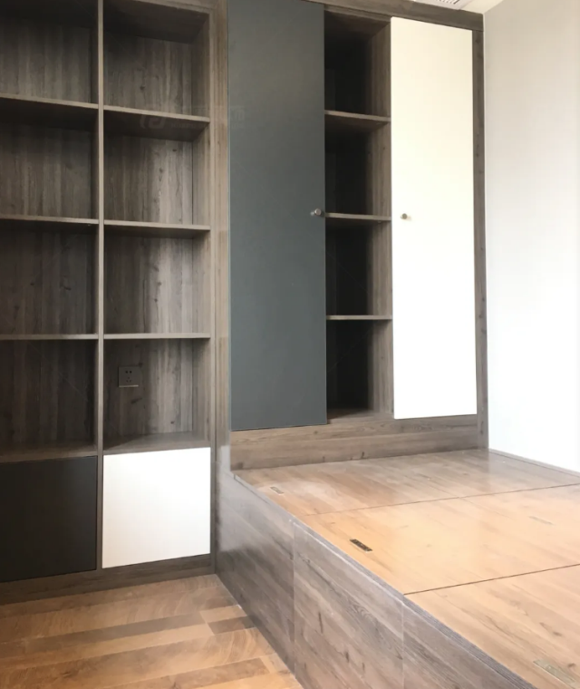 再次聚焦餐廳背景墻,內側的四分之一護墻板是隱形門,推開是榻榻米臥室,滿眼都是可收納的柜子,儲物能力相當強。