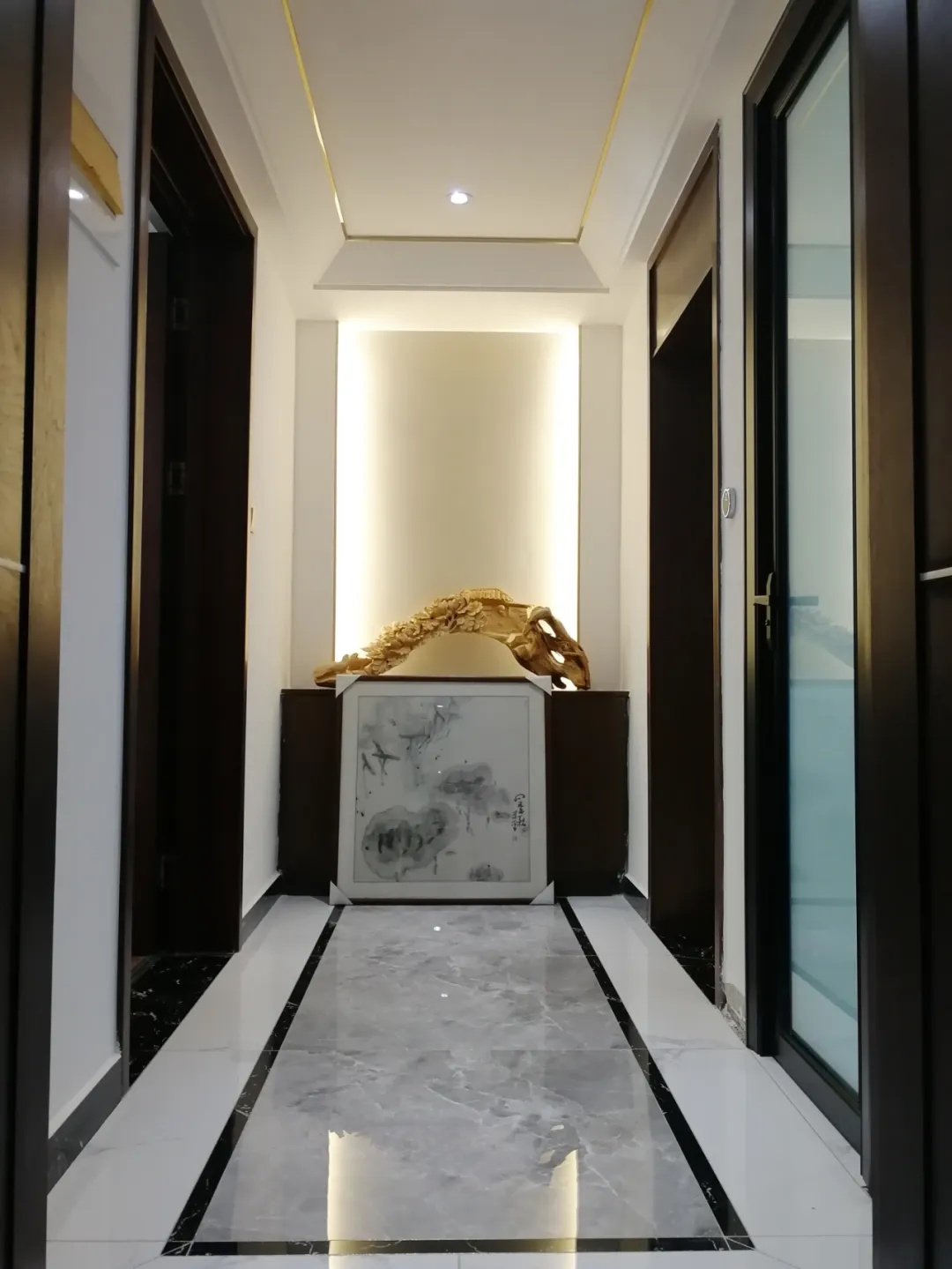 走廊:出電梯就是二樓的內(nèi)部通道,玄關(guān)盡頭墻面反燈槽設(shè)計(jì),掛畫(huà)+木雕裝飾,是整個(gè)走廊的點(diǎn)睛之筆。
