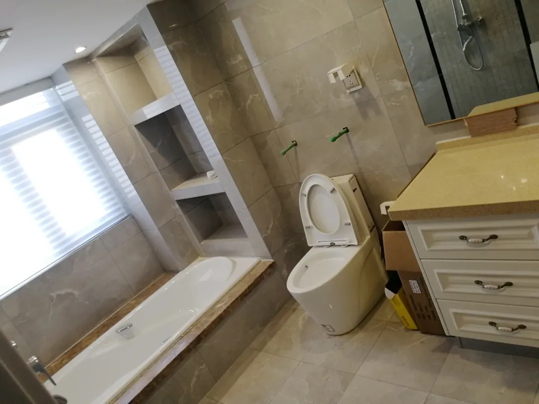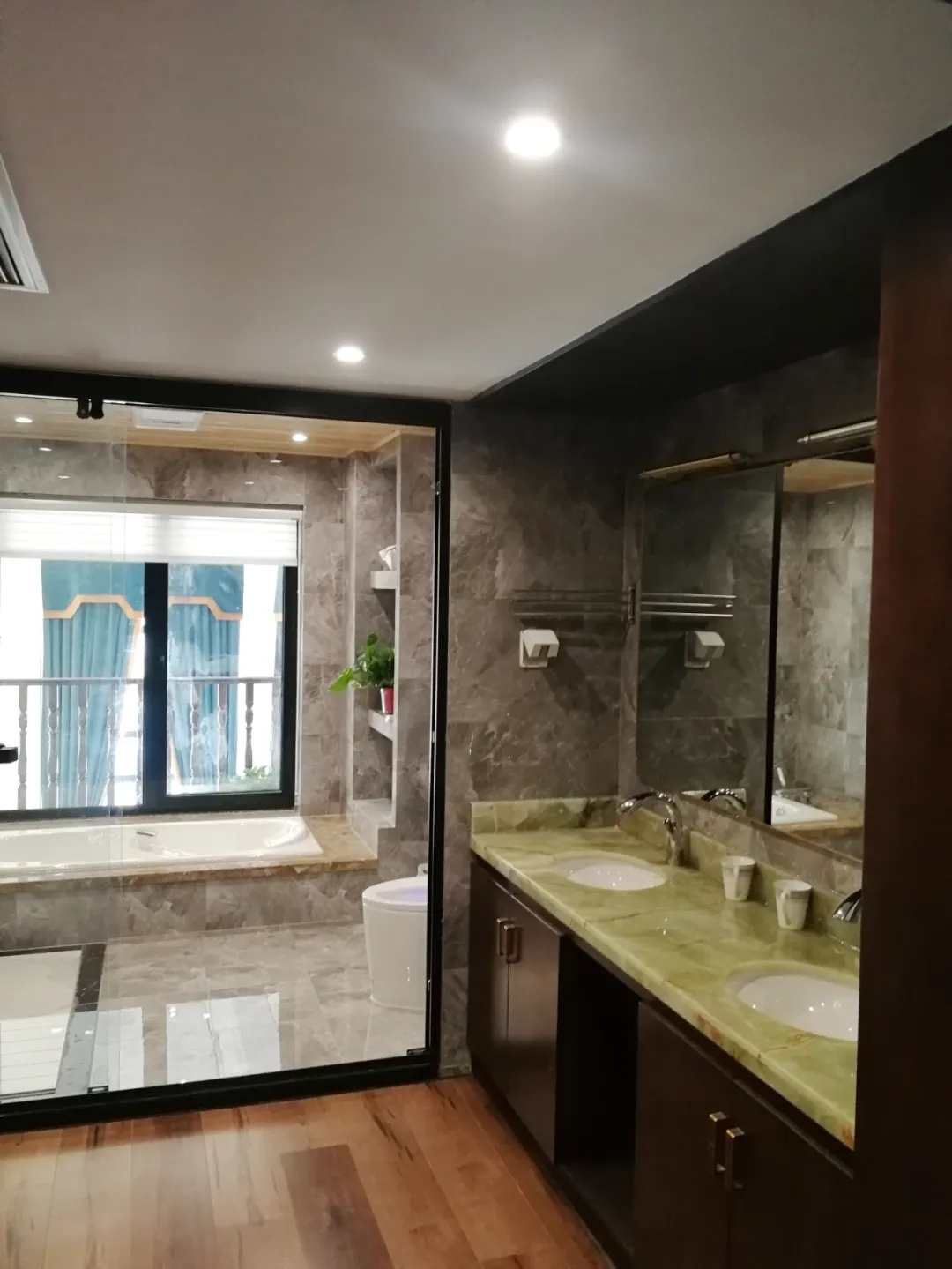 主衛(wèi)做干濕分離,雙人洗手盆,大理石臺(tái)面,嵌入式收納柜,很豪橫的設(shè)計(jì)。淋浴房和馬桶區(qū)通過(guò)玻璃門(mén)做隔斷,背景墻都是剪裁的800*800的大磚,黑色波打線收邊,防水槽+防滑槽處理,細(xì)節(jié)做得很到位。再看浴缸,大理石臺(tái)面+嵌入式浴盆+大的壁龕,質(zhì)感與實(shí)用共存。