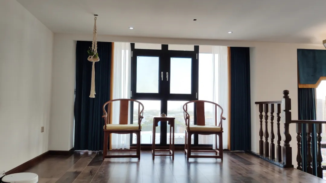 二樓架高部分融合次臥,改造了休閑茶室。扶梯直上,首先映入眼簾的是空曠的休閑區(qū),暫時(shí)陳設(shè)兩把圈椅,后期放吊床、瑜伽墊、跑步機(jī)等,可以是一家人鍛煉休閑的場(chǎng)所。走進(jìn)去是茶室,羅漢床,沏茶臺(tái),酒余茶后,提神益思。